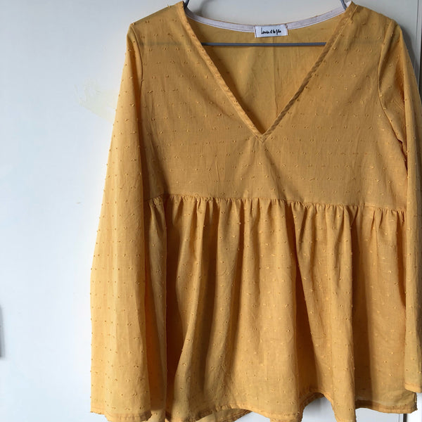 Judith est une blouse col V classique, avec une basque qui part après la poitrine à environ 30cm de l'épaule.