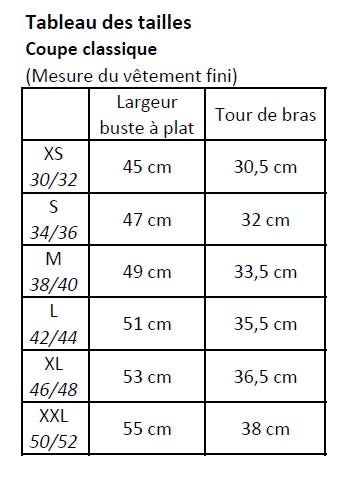 A partir de la taille 46, un supplément pourra vous être demandé pour la matière première.
