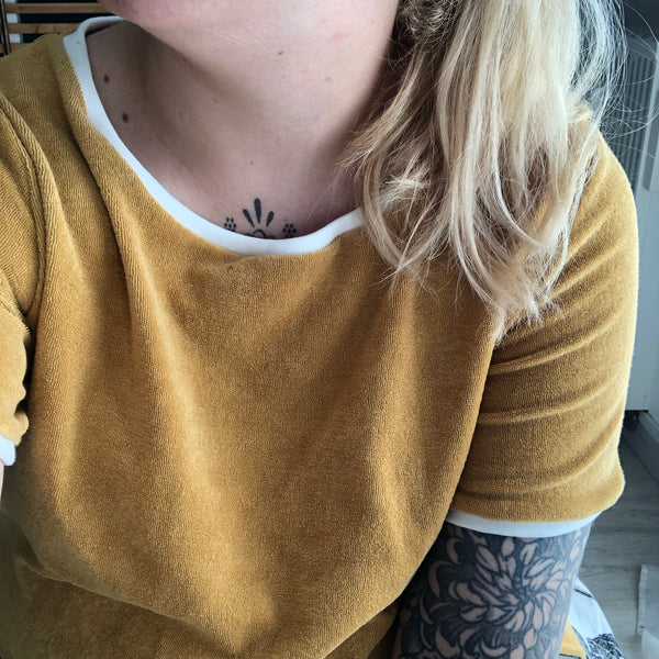 La tendance du moment c’est le tissu éponge ! Pas seulement réservé aux kids, il rentre dans notre dressing également ! Pour un look matchy matchy vous avez la possibilité de commander l’ensemble dans la collection Un10octobre dans le même tissu que vous.